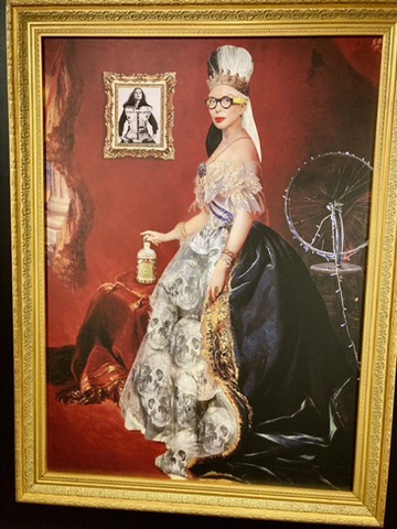 Ce sont onze visions très inspirées qui sont présentées. Certaines sont l’œuvre de plasticiennes confirmées, comme ORLAN qui s’est hybridée – une de ses spécialités – en impératrice Eugénie, nous livrant ainsi un portrait singulier. La couronne impériale posée sur un coussin se métamorphose en flacon Guerlain.